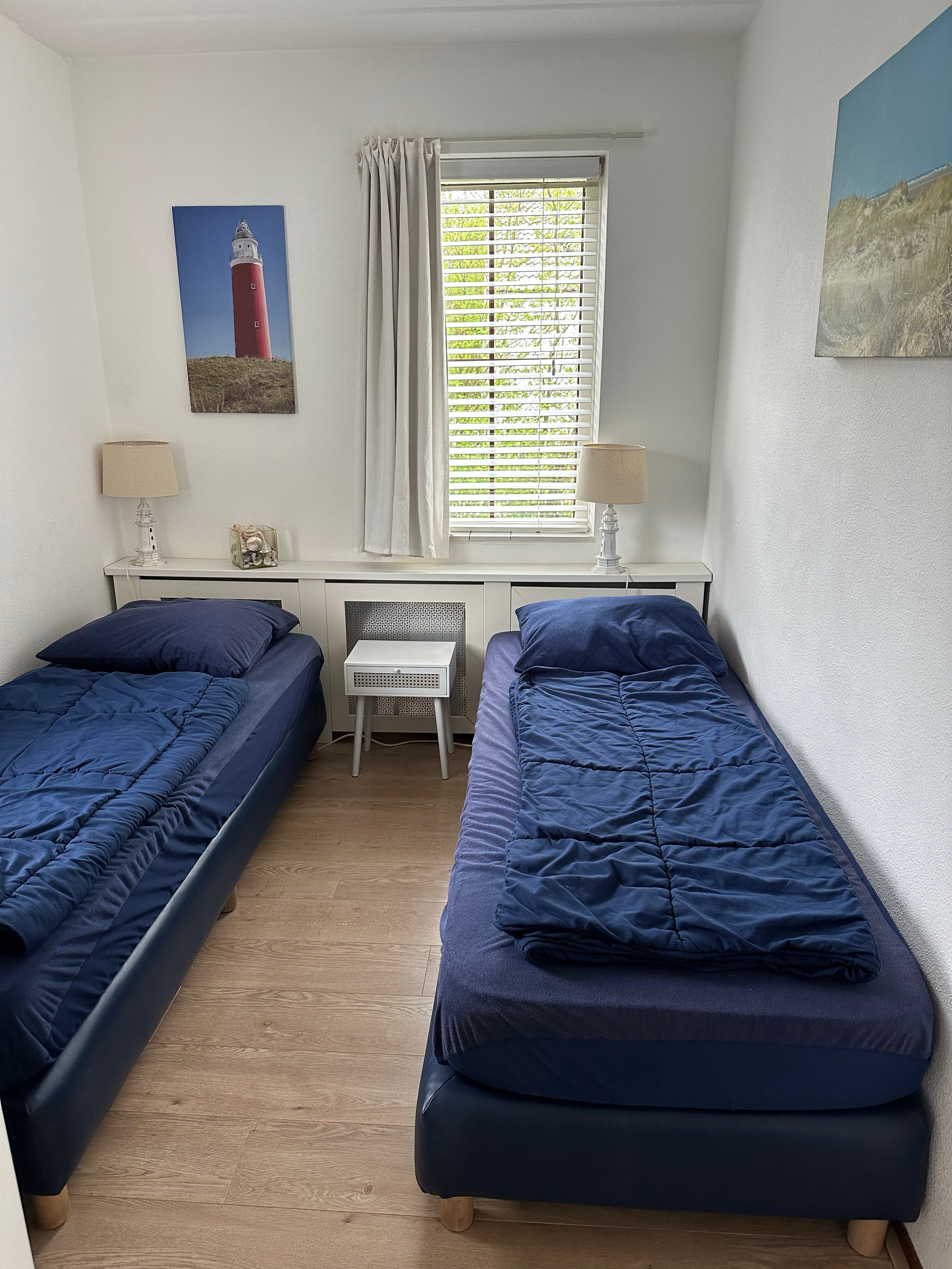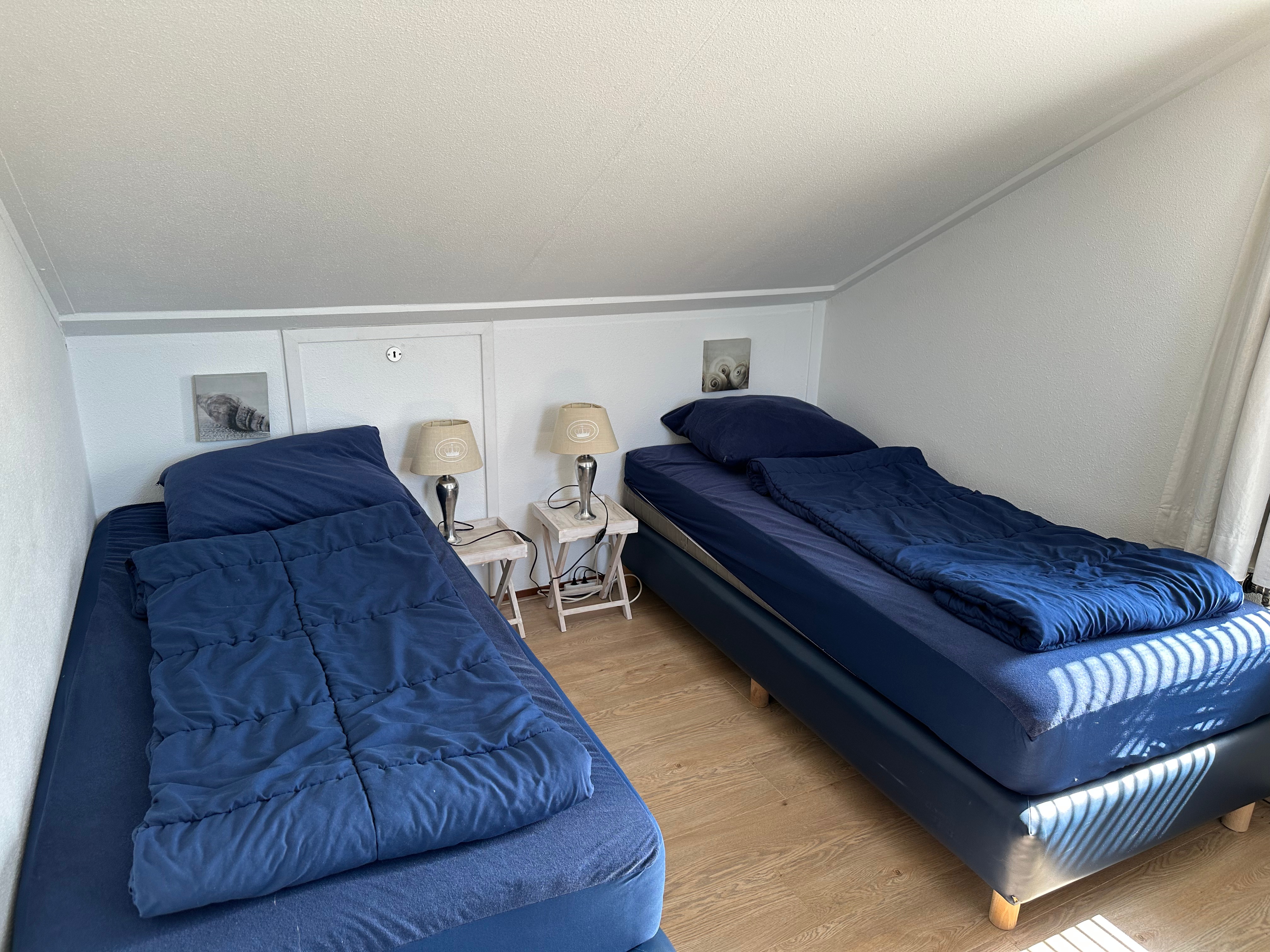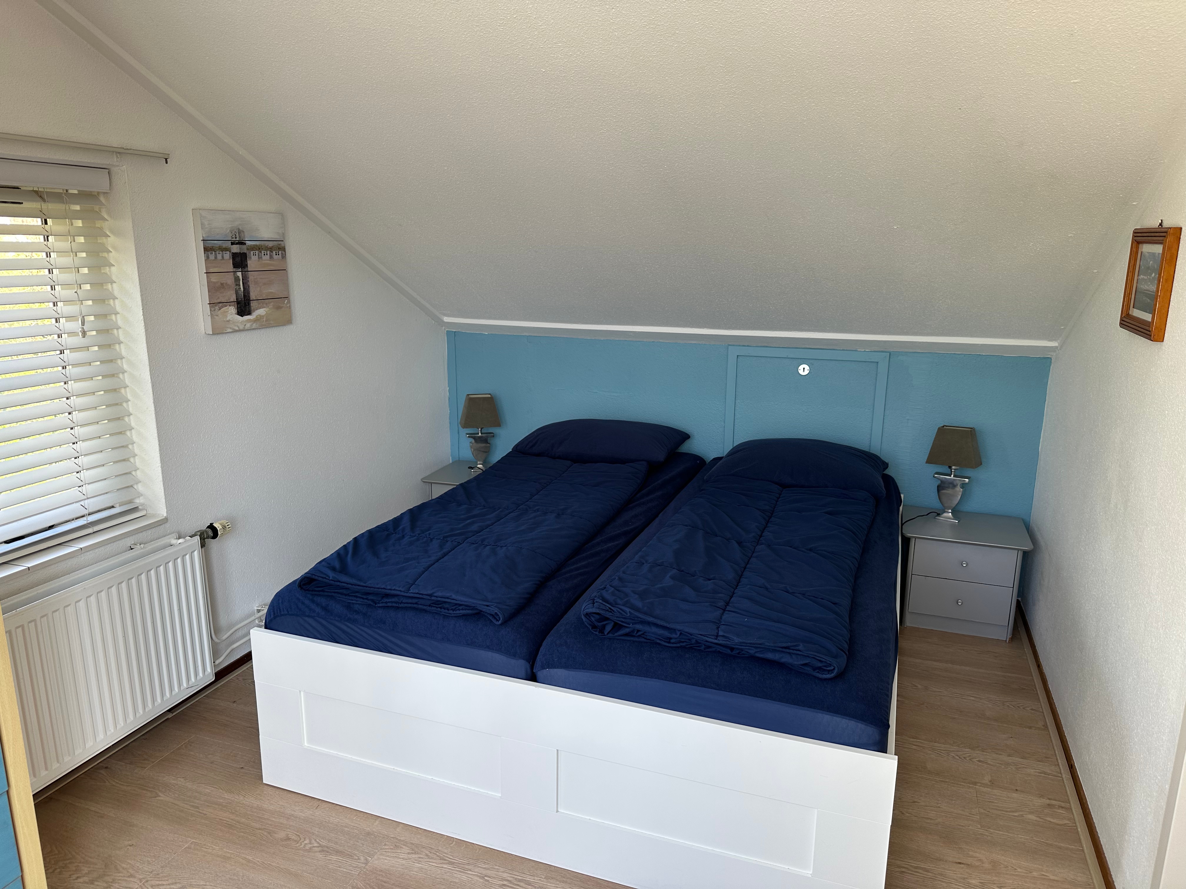 Unser Ferienhaus 613 mit Süd-/Westterasse hat im Erdgeschoss ein Schlafzimmer mit zwei Boxspringbetten, ein renoviertes Bad mit Badewanne und Sauna und ein seperates WC. In der oberen Etage befinden sich zwei weitere Schlafzimmer und ein neues Badezimmer (2019) mit Dusche und WC. Ein Schlafzimmer öffnet sich über eine breite, zweiflügelige Fenstertür zum Süd-/Westbalkon.