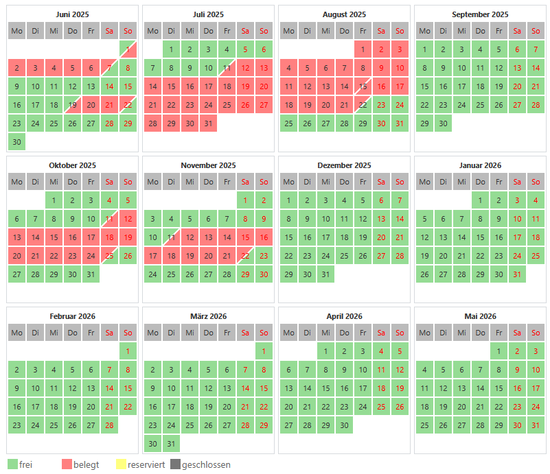 Im Kalender unten können Sie sehen, ob unser Haus in dem von Ihnen gewünschten Zeitraum noch verfügbar ist (grün). In der Hochsaison vermieten wir pro Woche (im Prinzip von Samstag bis Samstag), in der Nebensaison kann, nach Absprache, auch in einem beliebigen Zeitraum gemietet werden.