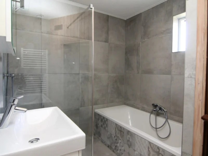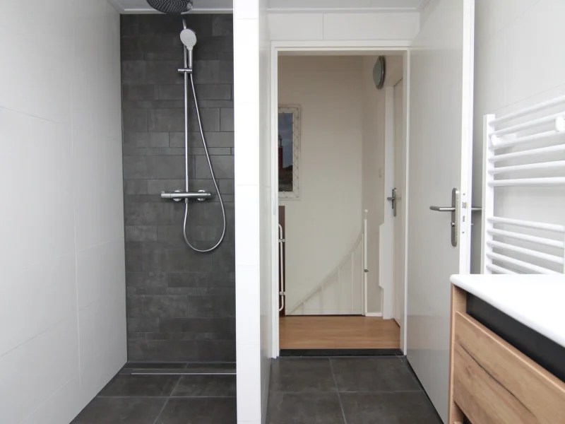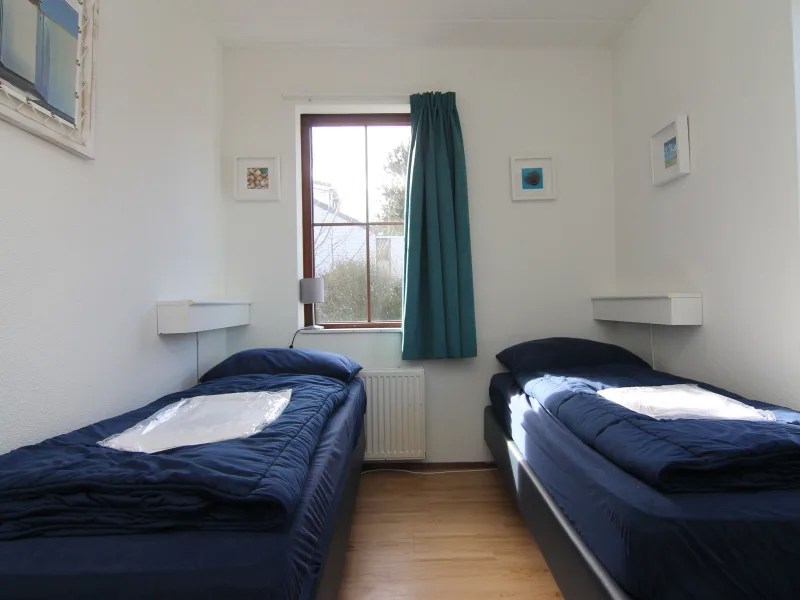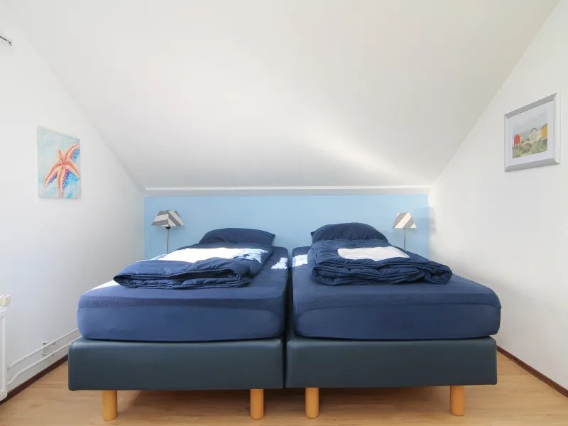 Dieses Ferienhaus mit Südterasse hat im Erdgeschoss ein Schlafzimmer mit zwei Boxspringbetten, ein renoviertes Bad (2022) mit barrierefreier Dusche, Badewanne und Sauna und ein seperates WC. In der oberen Etage befinden sich zwei weitere Schlafzimmer mit je zwei Boxspringbetten und ein neues Badezimmer (2024) mit Fußbodenheizung, barrierefreier Dusche und WC. Ein Schlafzimmer öffnet sich über eine breite, zweiflügelige Fenstertür zum Südbalkon.