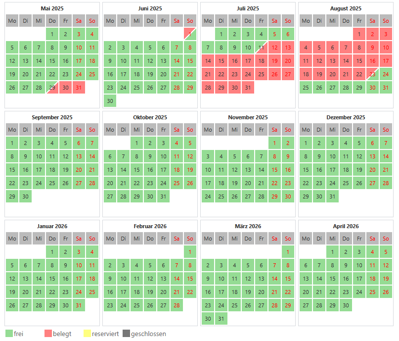 Im Kalender unten können Sie sehen, ob unser Haus in dem von Ihnen gewünschten Zeitraum noch verfügbar ist (grün). In der Hochsaison vermieten wir pro Woche (im Prinzip von Samstag bis Samstag), in der Nebensaison kann, nach Absprache, auch in einem beliebigen Zeitraum gemietet werden.